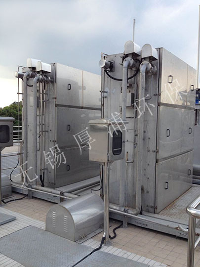 內(nèi)進(jìn)流式網(wǎng)板格柵除污機(jī)的機(jī)架為不銹鋼板材與型鋼組裝、焊接成的一整體式長方體剛性結(jié)構(gòu)。機(jī)架下部迎水端開有一個(gè)進(jìn)水洞口,機(jī)架的前后壁板上設(shè)有導(dǎo)軌,其上部還設(shè)有一內(nèi)部集渣槽,并延伸至機(jī)外。機(jī)架安裝于格柵井的中央,機(jī)架的兩側(cè)與格柵井之間的間隙為格柵濾后出水的通道。在機(jī)架的迎水端兩側(cè)布置了導(dǎo)流擋板,其在導(dǎo)流的同時(shí),可防止漂浮垃圾通過。
