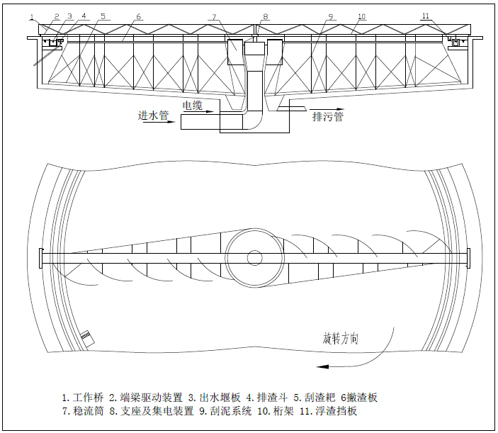 ZBG型周邊傳動吸泥機主要由穩流筒、集電裝置、中心支座、工作橋(主梁)、刮泥結構、排渣機構、驅動裝置、行走裝置和電控箱等部分組成。