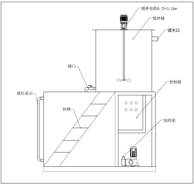 2、存藥箱:用于存放已經攪拌好的溶液,供投加設備用。
